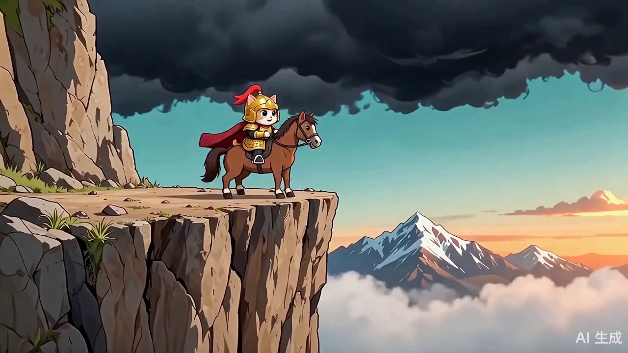 一幅史诗级可爱的场景。一只小巧可爱的卡通小猫将军,身穿细节精致的金色盔甲,头戴一个稍大的头盔,勇敢地站在悬崖上。他骑着一匹虽小但英勇的战马,说:”青海长云暗雪山,孤城遥望玉门关。黄沙百战穿金甲,不破楼兰终不还。“。悬崖下方,一支由老鼠组成的、数量庞大、无穷无尽的军队正带着临时制作的武器向前冲锋。这是一个戏剧性的、大规模的战斗场景,灵感来自中国古代的战争史诗。远处的雪山上空,天空乌云密布。整体氛围是“可爱”与“霸气”的搞笑和史诗般的融合。